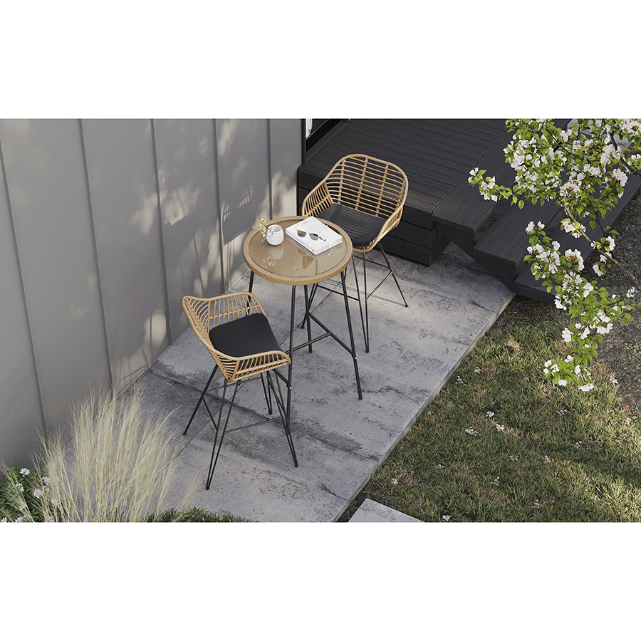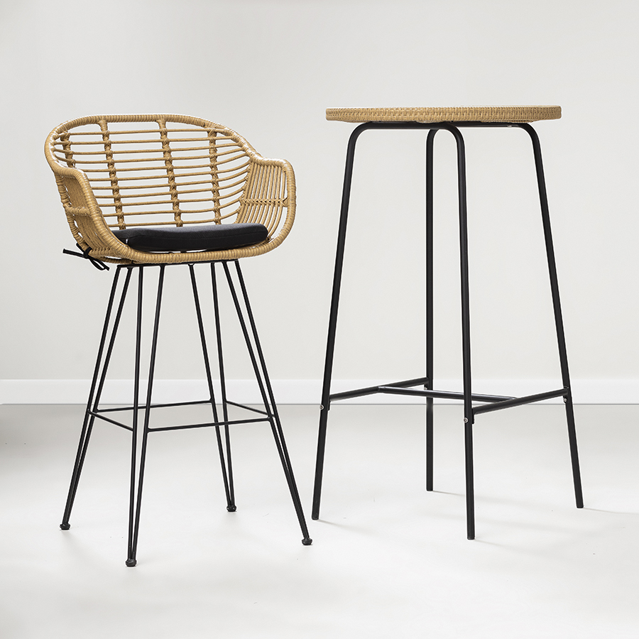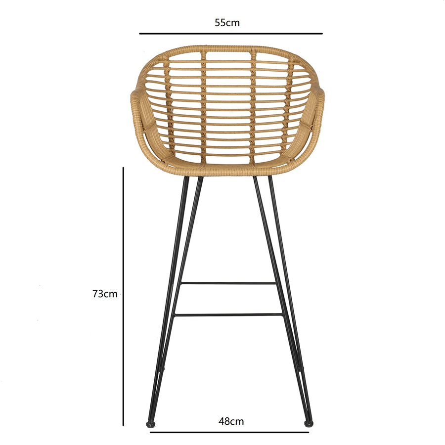 Материал: искусственный ротанг, сталь, полиэстер, пенополиуретан. Размеры: 55х57х105 см. Высота сиденья: 73 см. Высота подушки: 4 см.